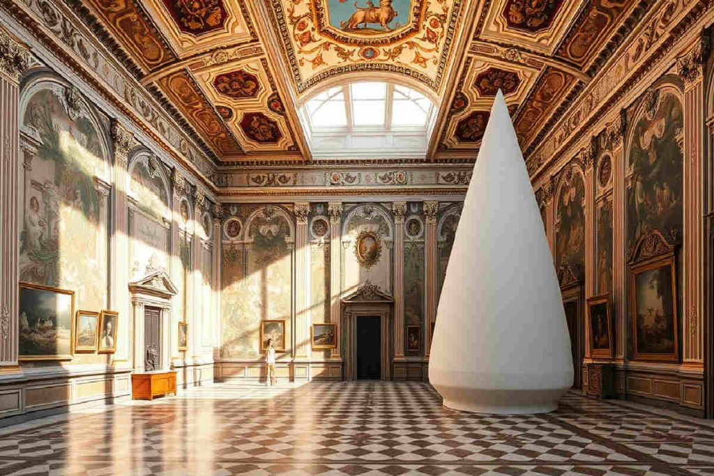Tre ambienti diversi, tre atmosfere uniche. Il grande salone quadrato, con soffitti affrescati e decorazioni ispirate ai giardini all’italiana, racconta un legame profondo tra natura e creatività. La piccola cappella di famiglia, intatta nel tempo, porta con sé un senso di sacralità e memoria. E poi lo spazio bianco, troncoconico, essenziale nelle forme, capace di evocare un conforto quasi materno. Qui, passato e presente non solo convivono: dialogano, si sfidano, si completano.